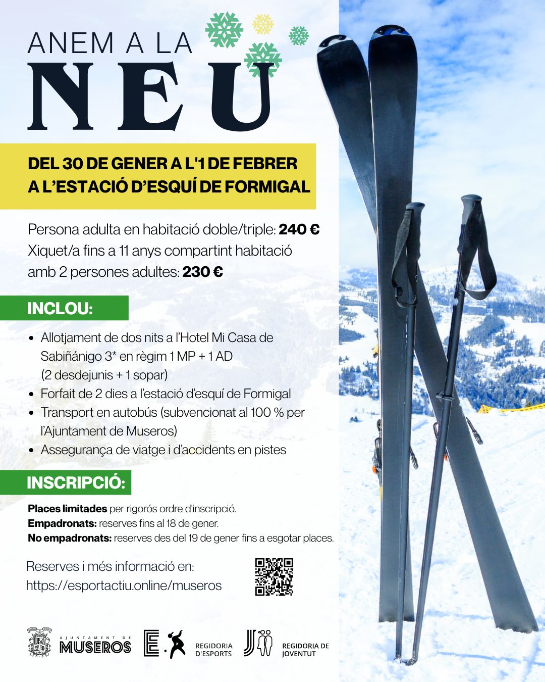 Las concejalías de Deportes y de Juventud del Ayuntamiento de Museros te proponen una escapada invernal a la estación de esquí de Formigal, en el Pirineo aragonés.