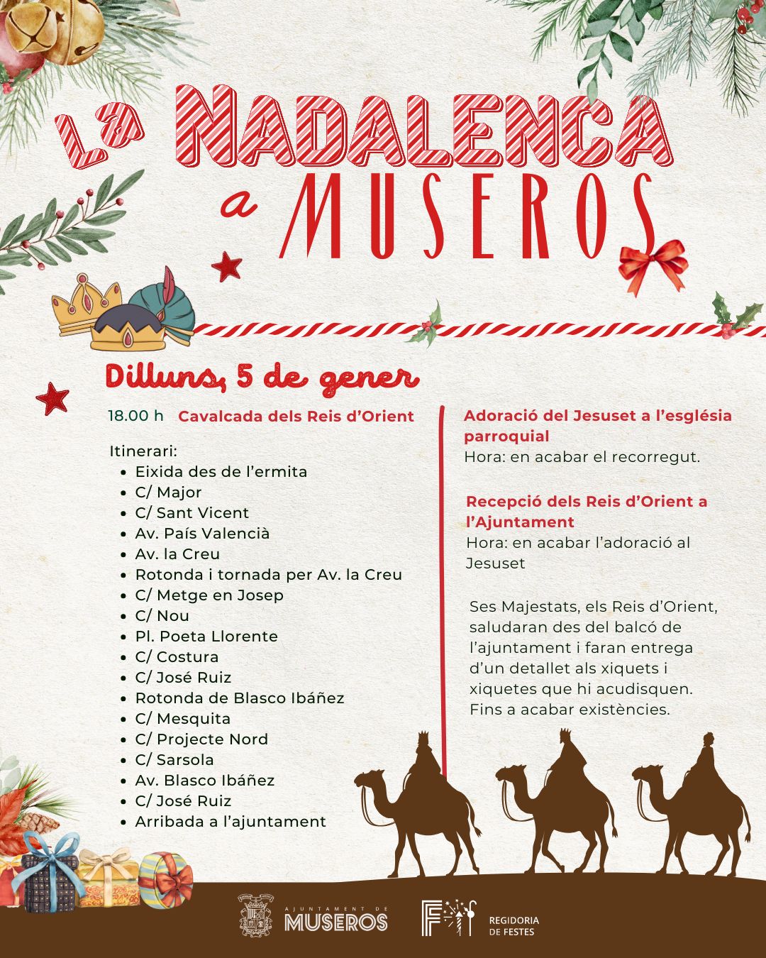 El Nadal arriba al seu punt àlgid amb la gran cavalcada dels Reis d’Orient, que recorrerà els carrers de Museros repartint il·lusió i alegria.