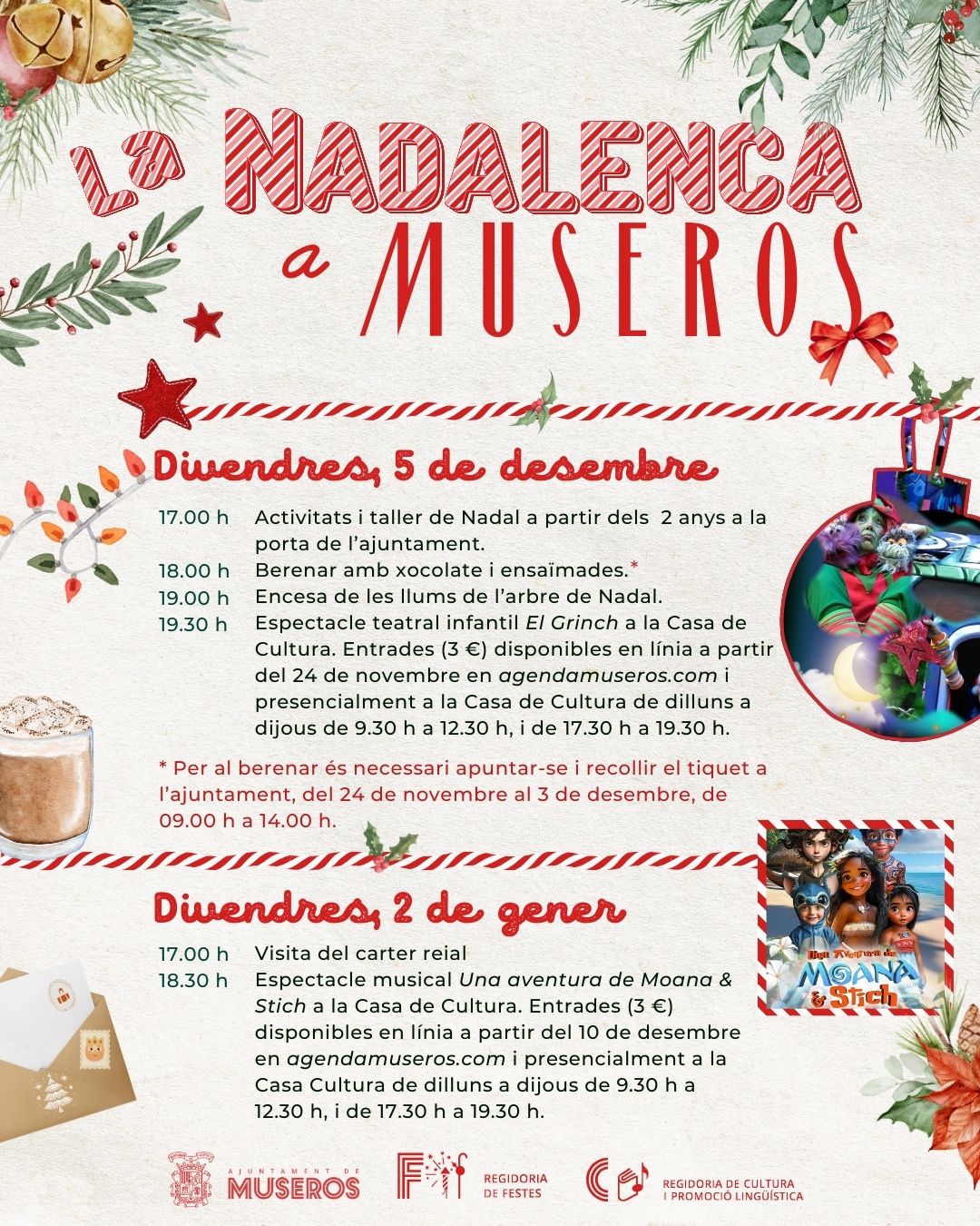 A les 18.30 h, gaudirem del musical infantil Una aventura de Moana & Stich. Les entrades, a 3 €, estaran disponibles a partir del 10 de desembre en agendamuseros.com i a la Casa de Cultura.
