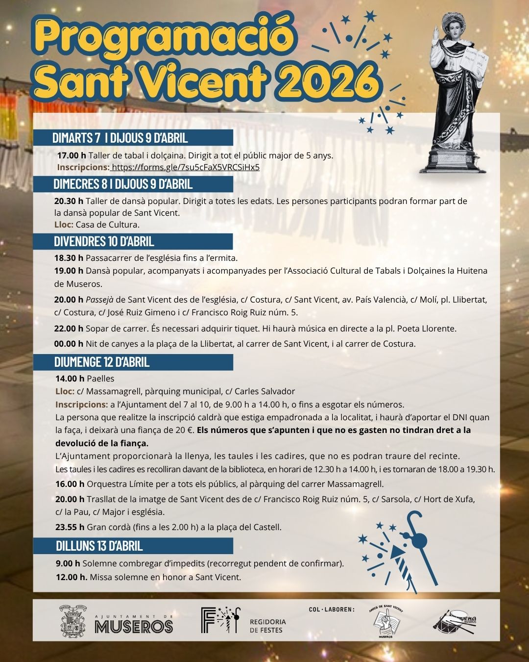 Torna una de les celebracions més estimades a Museros: la festa de Sant Vicent. Uns dies plens de tradició, música, pólvora i bon ambient que no vos podeu perdre del 7 al 13 d’abril. Taller de tabal i dolçaina, danses, passacarrers, paelles i actes per a totes les edats.