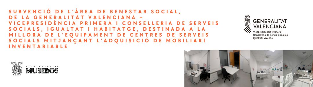 Per part de la Vicepresidència Primera i Conselleria de Serveis Socials, Igualtat i Habitatge de la Generalitat Valenciana, per resolució de 16/06/2025, dins del programa de subvencions per a projectes d’inversió en matèria d’equipament i obres en l’àmbit dels serveis socials, s’ha concedit a l’Ajuntament de Museros una subvenció per import de 2.939,63 € per a la remodelació dels espais de quatre despatxos del departament de Serveis Socials de Museros amb noves cadires, taules, calaixeres i armaris amb portes.